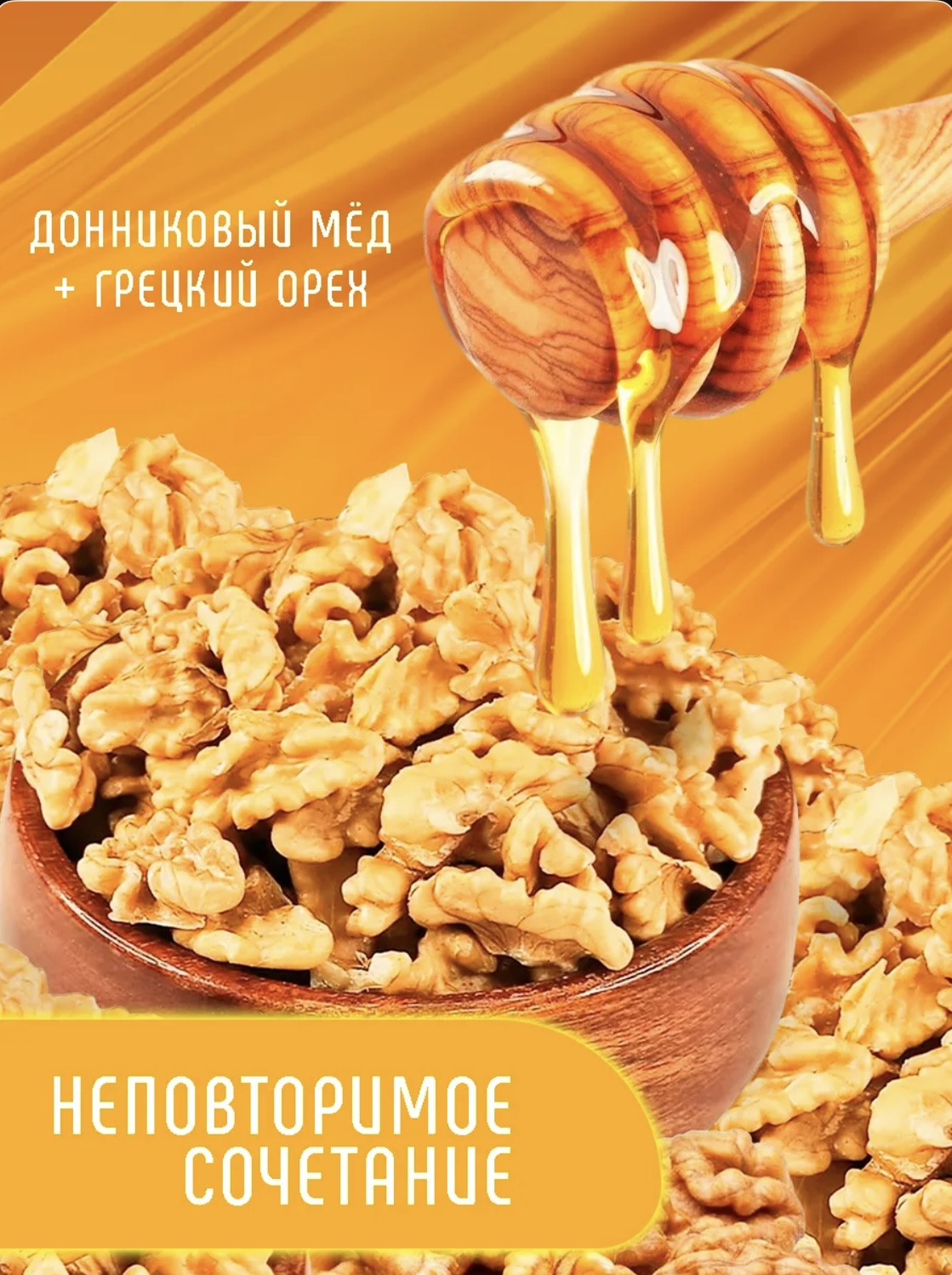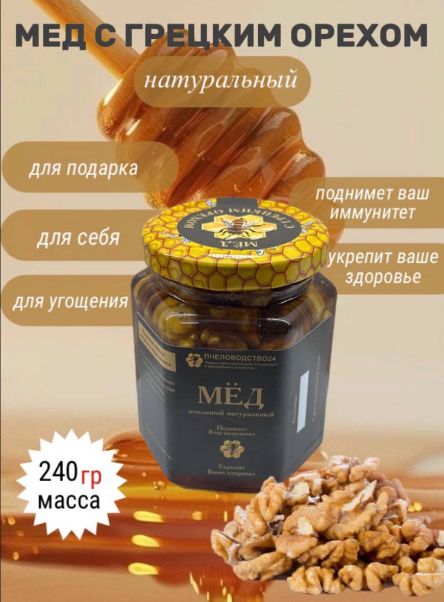 Наш натуральный мёд с добавлением свежих грецких орехов. Этот деликатес — не только изысканное лакомство, но и истинный источник здоровья и энергии. Идеально подходит для утреннего завтрака, торжественных блюд или в качестве приятного подарка близким.