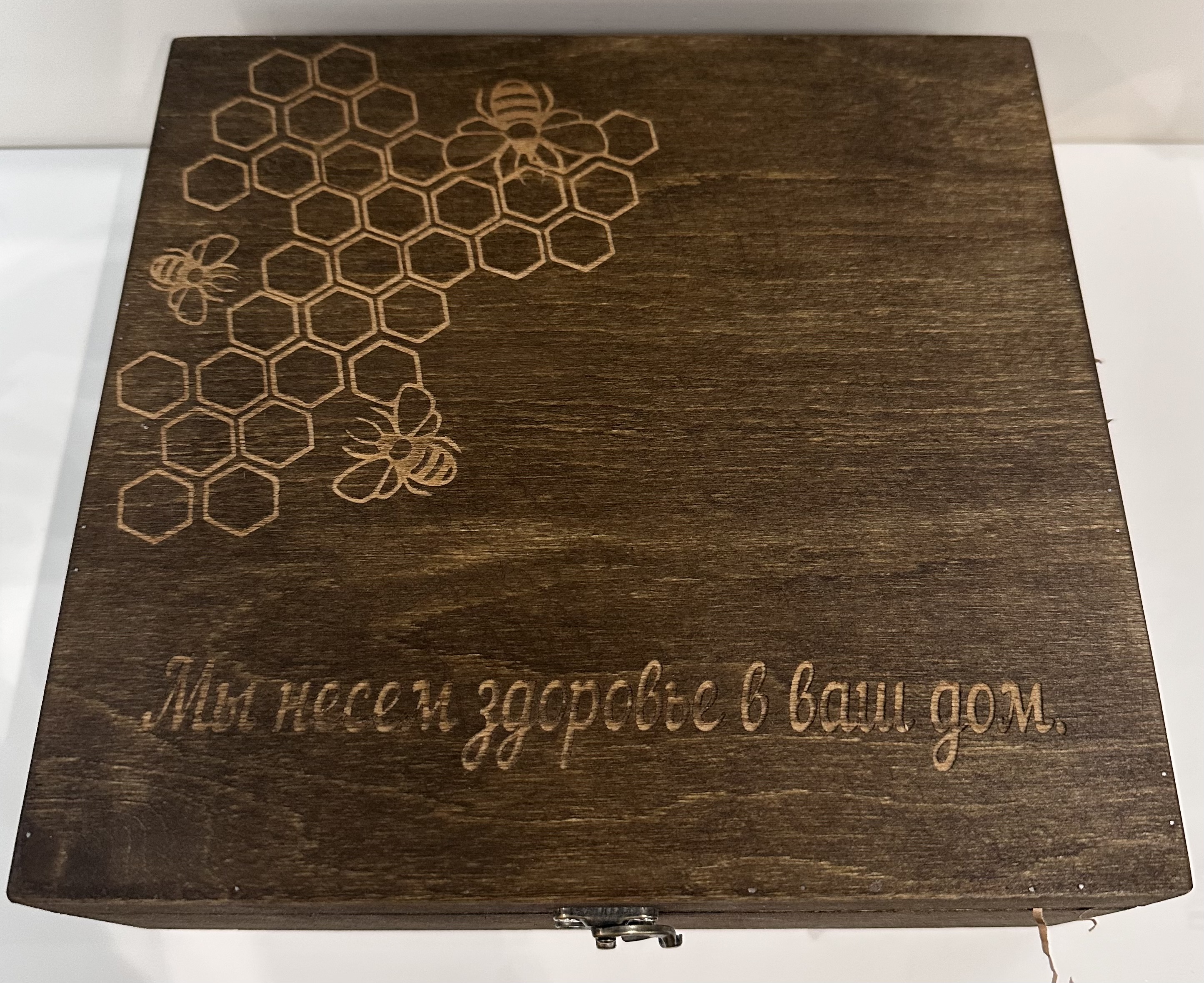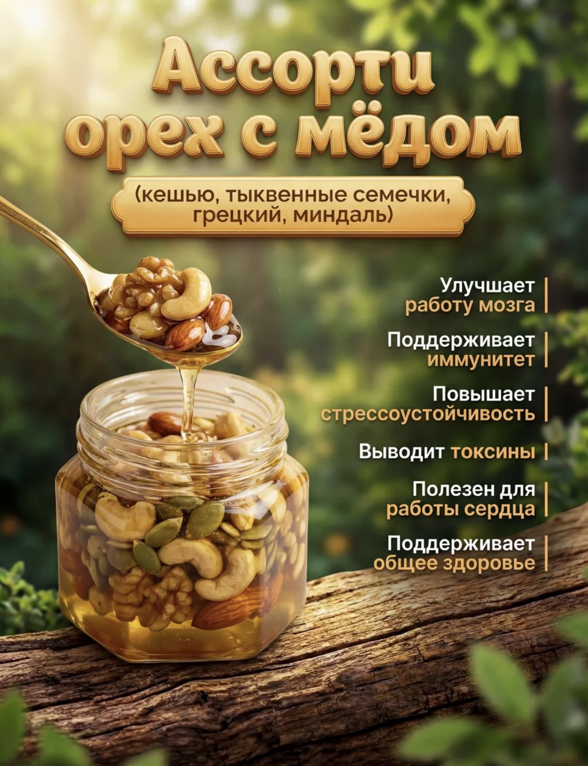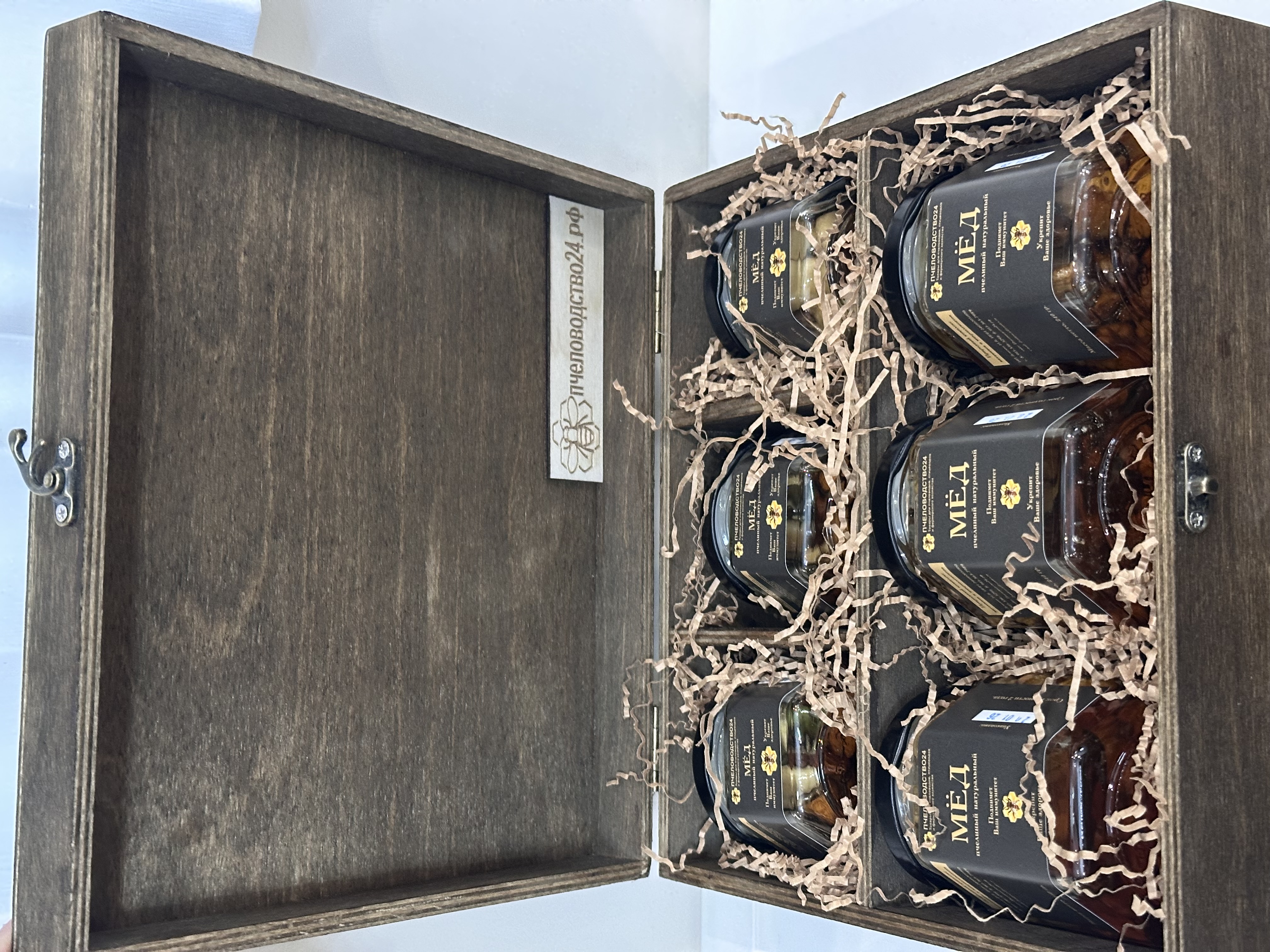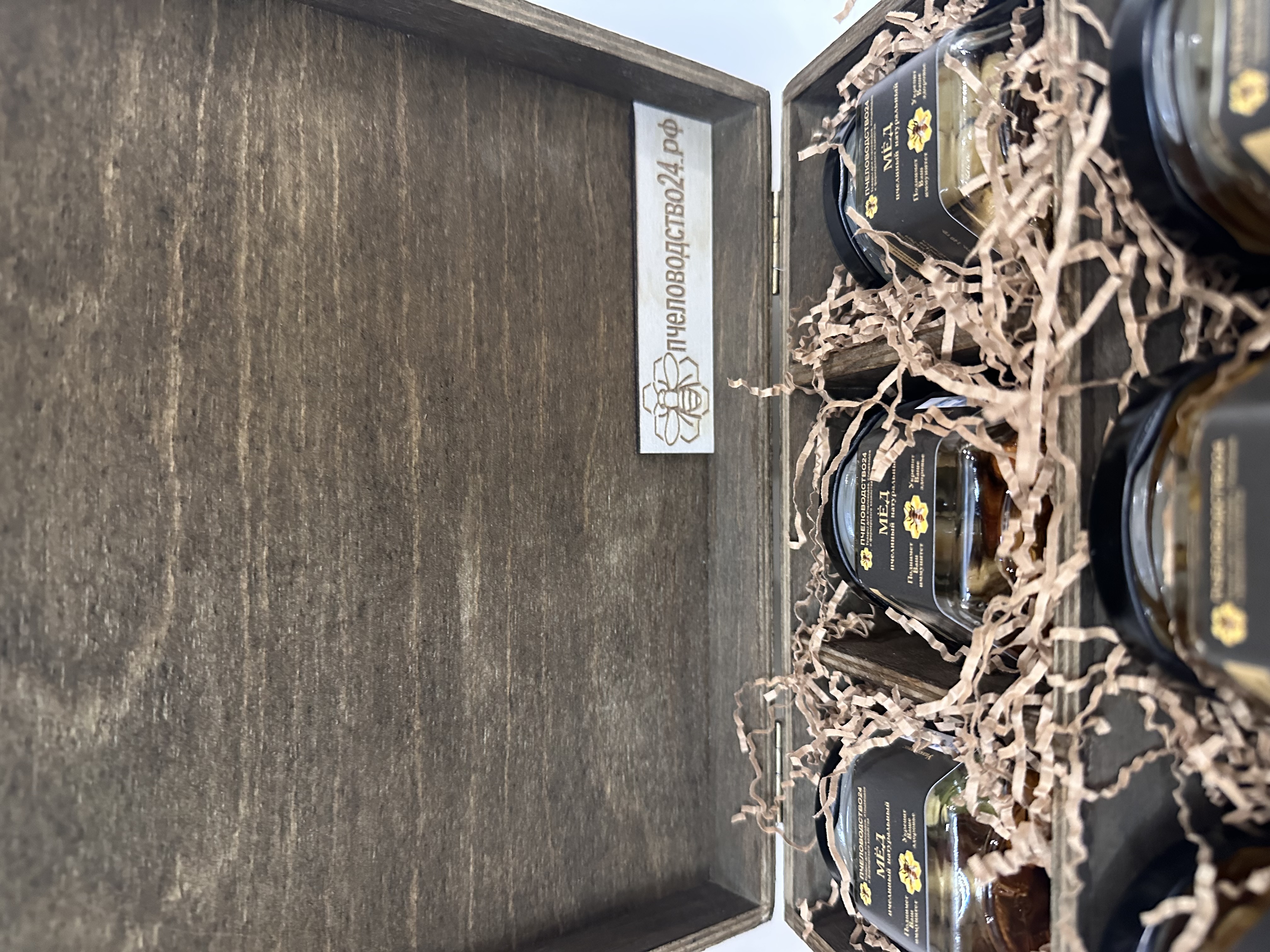 В набор входят баночки с натуральным медом и орехами: фундук, кешью, миндаль и ассорти орехов (миндаль, грецкий орех, тыквенные семечки, кешью), что делает его вкусным и полезным презентом.
