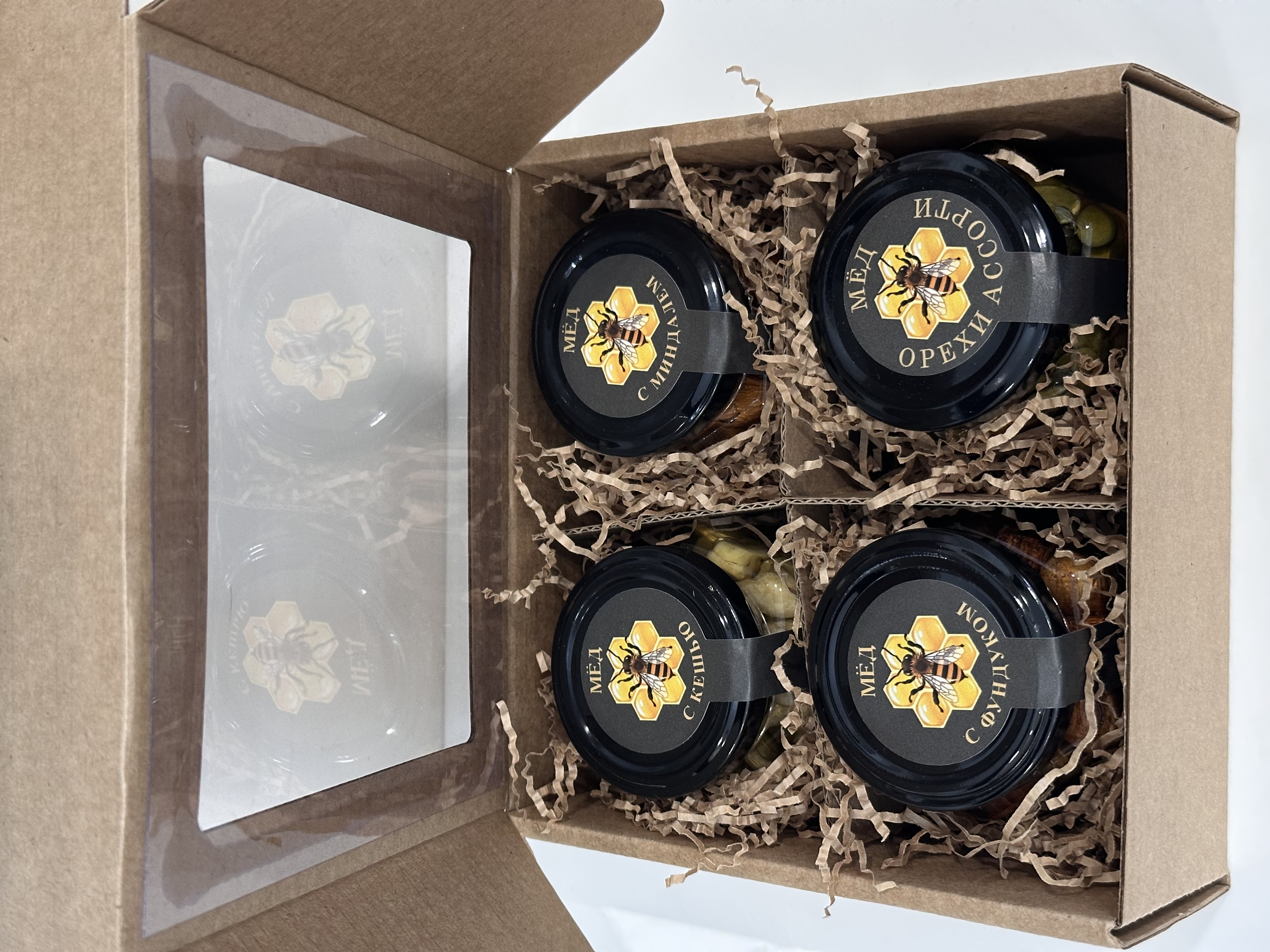 В набор входят баночки с натуральным медом и орехами: фундук, кешью, миндаль и ассорти орехов (миндаль, грецкий орех, тыквенные семечки, кешью), что делает его вкусным и полезным презентом. Мед с орехами в банке — натуральный продукт, богатый витаминами и минералами, который укрепляет иммунитет, улучшает работу пищеварения и благоприятно влияет на печень.