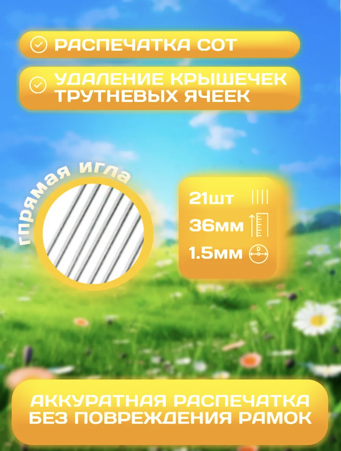 Основа вилки для распечатывания сот «Европа» изготовлена из жёлтого полистирола в которой зафиксированы 21-а прямая игла из нержавейки длинной 36 мм и диаметром 1,5 мм.